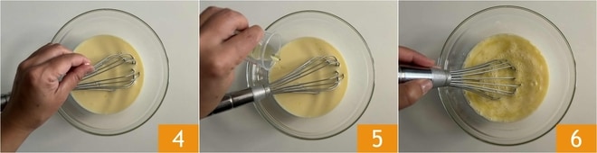 Fügen Sie eine Prise Salz 4 und das Olivenöl extra vergine 5 hinzu und rühren Sie weiterhin mit dem Schneebesen 6.
