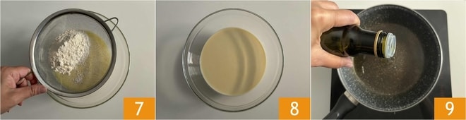 Nun fügen Sie nach und nach das gesiebte Mehl durch ein Sieb hinzu 7, rühren Sie dabei immer weiter mit dem Schneebesen, um die Bildung von Klumpen zu vermeiden und einen glatten und homogenen Teig zu erhalten 8. Geben Sie einen Tropfen Öl in eine Pfanne mit einem Durchmesser von 18 cm 9.