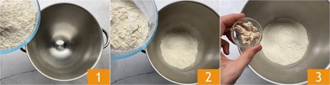 Um die Crescentine (oder Tigelle) zuzubereiten, geben Sie das Mehl 0 1 und das Mehl 00 in die Schüssel der Küchenmaschine 2, dann fügen Sie die frische Hefe hinzu 3.