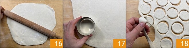 Nach der Gehzeit bemehlen Sie leicht sowohl die Arbeitsfläche 13 als auch den Teig 14 und beginnen, ihn mit Hilfe eines Nudelholzes auszurollen 15. Wenn sich der Teig beim Ausrollen stark zurückzieht, warten Sie ein paar Minuten, damit der Teig sich entspannen kann.