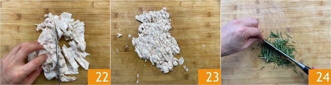 Um die Cunza zuzubereiten, schneiden Sie den Speck mit dem Messer 22, um eine gleichmäßige Konsistenz zu erzielen 23. Hacken Sie auch die Rosmarinnadeln fein 24