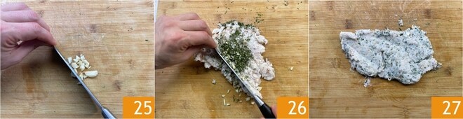 Schließlich machen Sie dasselbe mit dem Knoblauch 25. Mischen Sie die Zutaten 26 und hacken Sie weiter mit dem unteren Teil des Messers ohne Eile, es dauert etwa zehn Minuten und Sie erhalten eine weiche und seidige Cunza 27.