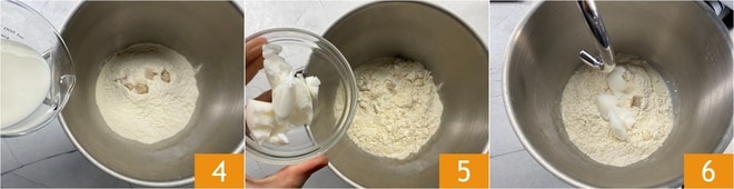 Geben Sie die Milch 4 und das Schmalz 5 hinzu, dann schalten Sie die Küchenmaschine mit Haken auf niedriger Geschwindigkeit ein 6.
