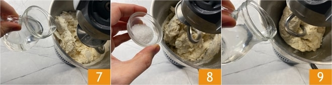 Sobald die ersten Zutaten eingearbeitet sind, erhöhen Sie leicht die Geschwindigkeit der Küchenmaschine und fügen das Wasser nach und nach hinzu 7. Zu diesem Zeitpunkt geben Sie auch das Salz 8 hinzu und gießen das Wasser weiter in einem dünnen Strahl hinzu 9, wobei Sie darauf achten, dass es gut in den Teig eingearbeitet wird.