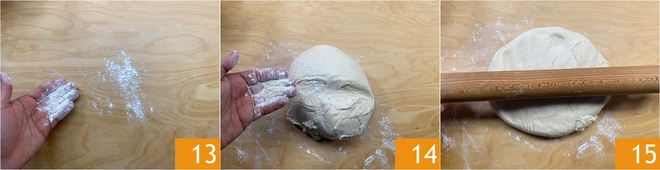 Nach der Gehzeit mehlen Sie sowohl das Nudelbrett leicht ein 13 als auch den Teig 14 und beginnen Sie, ihn mit einem Nudelholz auszurollen 15. Sollte sich der Teig beim Ausrollen stark zusammenziehen, warten Sie ein paar Minuten, damit er sich entspannen kann.