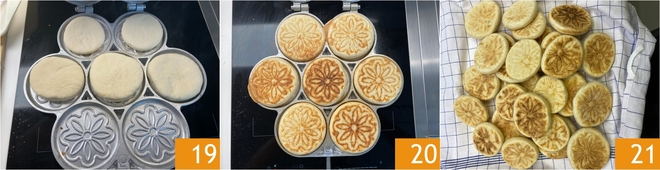 Sie sind bereit zum Backen: Erhitzen Sie Ihre Tigelliera, legen Sie die Kreise in die Fächer und backen Sie sie 5 Minuten auf jeder Seite 19. Sobald die Tigelle goldbraun sind und das typische Blumenmuster aufweisen 20, legen Sie sie auf ein mit einem Küchentuch ausgelegtes Tablett 21 und decken Sie sie damit ab: So bleiben sie innen weich und außen knusprig. Ihre Tigelle sind fertig, genießen Sie sie pur oder gefüllt!