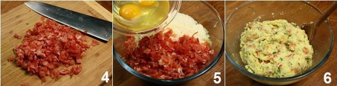 Dann den Speck zerkleinern und zum Teig geben 4, anschließend die Eier und den geriebenen Grana Padano hinzufügen 5. Alle Zutaten gut vermischen 6