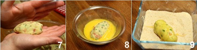 und mit den Händen einen Teil der Masse (ca. 50 g) nehmen und zu Kroketten formen 7. Die Kroketten dann in das verquirlte Ei tauchen 8 und anschließend in die Semmelbrösel geben 9