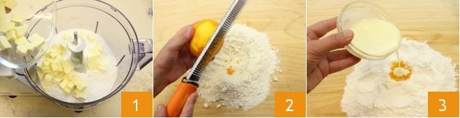 Um die Torte mit karamellisierten Orangen zuzubereiten, beginnen Sie mit dem Mürbeteig: Geben Sie in einen Mixer mit Klingen das gesiebte Mehl und die kalte Butter aus dem Kühlschrank in Stückchen 1. Machen Sie eine Sandmasse, gießen Sie sie dann auf ein Arbeitsfläche und formen Sie die klassische Brunnenform. In die Mitte reiben Sie die Schale einer unbehandelten Orange 2 und fügen Sie die Kondensmilch hinzu 3