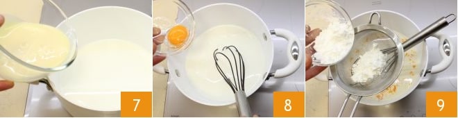 Bereiten Sie in der Zwischenzeit die Orangencreme zu: Geben Sie in einen Topf die frische Milch, die Kondensmilch 7 und mischen Sie mit einem Schneebesen, um die Zutaten zu vermengen. Fügen Sie die Eigelbe einzeln hinzu 8 und das mit einem Sieb gesiebte Maisstärke 9.