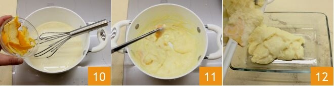 Fügen Sie dann die ganze Schale einer unbehandelten Orange hinzu 10 und schalten Sie die niedrige Hitze ein, um die Creme zu kochen und einzudicken, wobei Sie ständig rühren. Sobald sie fertig ist, entfernen Sie die Orangenschale 11 und gießen Sie die Creme in eine große und flache Auflaufform 12.