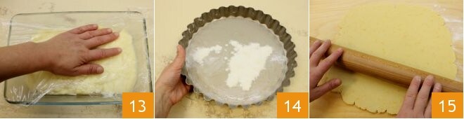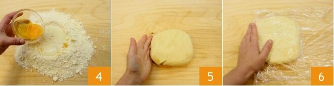 und ein Eigelb 4. Bearbeiten Sie den Teig schnell mit den Händen, um zu vermeiden, dass er sich zu sehr erwärmt. Formen Sie einen Laib 5, drücken Sie ihn flach und wickeln Sie ihn in Frischhaltefolie ein 6; stellen Sie den Mürbeteig etwa 30 Minuten lang in den Kühlschrank zum Festwerden.