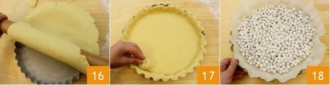 Rollen Sie den Teig um das Nudelholz und rollen Sie ihn vorsichtig auf die Form 16, dann schneiden Sie die Ränder ab, indem Sie den überschüssigen Teig entfernen, und verwenden Sie ihn, eingewickelt in wenig Frischhaltefolie, um den Boden gut an die Form anzupassen 17. Fahren Sie dann mit dem Blindbacken fort: Legen Sie den Mürbeteig mit Backpapier aus und legen Sie Keramikkugeln (oder Hülsenfrüchte wie Bohnen oder Kichererbsen) darauf 18. Backen Sie dann im vorgeheizten statischen Ofen bei 170° für 20 Minuten (im Umluftofen bei 160° für 10 Minuten). Entfernen Sie dann die Gewichte und backen Sie weiter für 10 Minuten bei der gleichen Temperatur (5 Minuten, wenn Umluftofen).