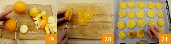 Bereiten Sie in der Zwischenzeit die karamellisierten Orangen für die Dekoration vor: Schälen Sie die Orangen 19, schneiden Sie sie in dünne Scheiben von 1 cm 20 und legen Sie sie auf ein mit Backpapier ausgelegtes Backblech. Bestreuen Sie jede Scheibe mit Vollrohrzucker 21 und grillen Sie sie für etwa 10 Minuten bei 240°-250°.