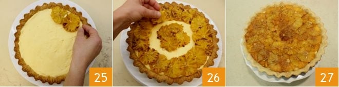 Legen Sie dann die Orangenscheiben über die Creme, im Strahlenmuster angeordnet (25-25), um die gesamte Oberfläche zu bedecken: Ihre Torte mit karamellisierten Orangen ist bereit, genossen zu werden 27.