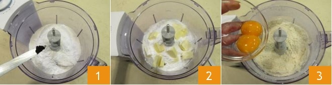 Um die karamellisierte Feigentarte zuzubereiten, beginnen Sie mit der Zubereitung des Mürbeteig. Geben Sie in die Schüssel eines Mixers mit Schneideklingen das Mehl, den Puderzucker, eine Prise Salz und die Samen einer Vanilleschote 1 (um sie zu entnehmen, schneiden Sie einfach die Schote auf und kratzen den Inhalt mit einem scharfen Messer heraus). Fügen Sie auch die in Würfel geschnittene kalte Butter aus dem Kühlschrank hinzu 2 und schalten Sie den Mixer ein, bis die Butter fein wie Sand ist, dann fügen Sie auch die Eigelbe hinzu 3.