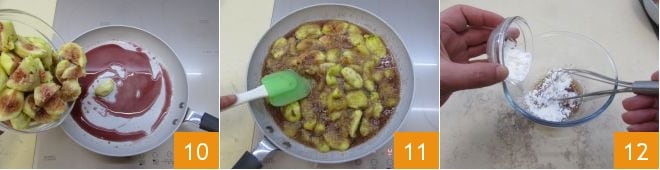 Lassen Sie den Zucker zusammen mit dem Wein bei schwacher Hitze schmelzen und fügen Sie die Feigen hinzu 10, rühren Sie alles um und lassen Sie es etwa 20 Minuten kochen 11. Sobald sie gekocht sind, nehmen Sie ein paar Löffel des Saftes, den sie freigesetzt haben, und mischen ihn in einer kleinen Schüssel mit der Speisestärke und schlagen Sie schnell mit einem Schneebesen, um Klumpenbildung zu vermeiden 12.
