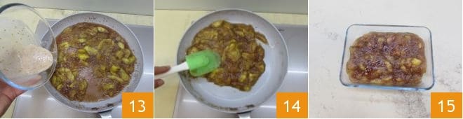 Geben Sie die Flüssigkeit wieder in die Pfanne 13, rühren Sie um und lassen Sie alles 5-6 Minuten weiter kochen, bis das Kompott eindickt 14, und lassen Sie es in einer Auflaufform abkühlen 15.