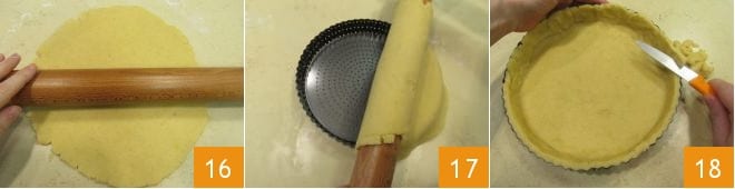Nehmen Sie nun den Mürbeteig aus dem Kühlschrank und rollen Sie ihn auf einer leicht bemehlten Arbeitsfläche zu einem Kreis von etwa 4 mm Dicke aus 16. Heben Sie den ausgerollten Mürbeteig mit Hilfe eines Nudelholzes an und legen Sie ihn vorsichtig in eine runde Backform mit einem Durchmesser von 24 cm 17. Drücken Sie den Mürbeteig in die Form und schneiden Sie mit einem kleinen Messer den überschüssigen Rand ab, der über den Rand hinausragt 18.