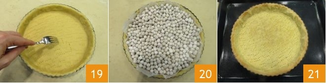 Stechen Sie den Boden der Tarte mit einer Gabel ein 19, legen Sie ein Stück Backpapier auf die Tarte und füllen Sie es mit Keramikkugeln 20 (oder getrockneten Kichererbsen), damit der Teig beim Backen nicht aufgeht. Backen Sie den Mürbeteig im vorgeheizten statischen Ofen bei 180° für 20 Minuten (wenn Sie einen Umluftofen verwenden, backen Sie den Boden bei 160° für etwa 15 Minuten). Entfernen Sie dann die Kugeln und backen Sie weitere 5-6 Minuten, während derer der Teig goldbraun werden sollte, aber nicht überbacken werden darf 21.