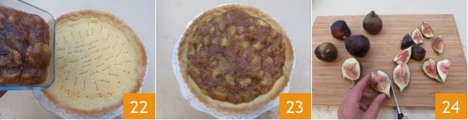 Lassen Sie den Mürbeteig abkühlen, und erst wenn auch das Feigenkompott abgekühlt ist, können Sie es auf den Boden Ihrer Tarte geben 22. Glätten Sie die Oberfläche gut 23 und kümmern Sie sich um das Karamellisieren der Feigen. Reinigen Sie die für die Dekoration benötigten Feigen, indem Sie sie sehr vorsichtig mit kaltem Wasser abspülen und ohne sie zu schälen in 4 Stücke teilen 24.