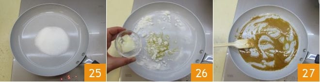 Geben Sie den Zucker in eine Pfanne 25 und lassen Sie ihn karamellisieren, fügen Sie die Butter hinzu, sobald der Zucker zu schmelzen beginnt 26. Rühren Sie mit einem Holzlöffel, bis Sie ein bernsteinfarbenes Karamell erhalten 27.