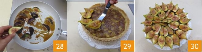 Fügen Sie nun die Feigen hinzu und lassen Sie sie auf beiden Seiten für ein paar Minuten karamellisieren 28. Dann legen Sie mit Hilfe eines Spatels und achten Sie darauf, sich nicht zu verbrennen, die karamellisierten Feigen auf die Tarte 29. Beenden Sie die Dekoration Ihrer Tarte mit karamellisierten Feigen und servieren Sie sie 30.
