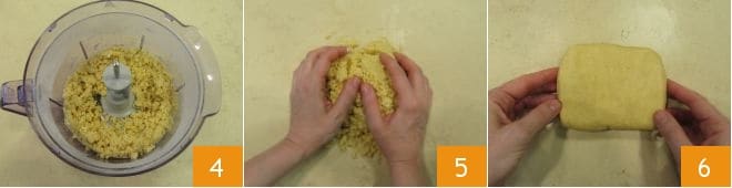 Mixen Sie erneut, bis Sie grobe Krümel erhalten 4. Geben Sie die Mischung auf eine Arbeitsfläche und kneten Sie sie schnell mit den Händen 5, ohne sie zu stark zu erwärmen. Sobald Sie eine homogene Masse erhalten haben, formen Sie einen Block daraus 6, wickeln Sie ihn in Frischhaltefolie ein und stellen Sie ihn für mindestens 30 Minuten in den Kühlschrank.