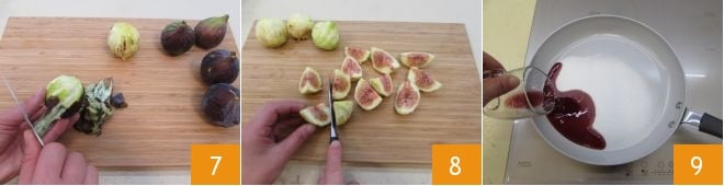 In der Zwischenzeit kümmern Sie sich um das Feigenkompott. Schälen Sie Ihre Feigen 7 und schneiden Sie sie in 4 Stücke 8. Geben Sie den Kristallzucker zusammen mit dem Wein in einen Topf 9.