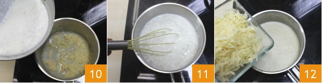 Nehmen Sie den Topf vom Herd und fügen Sie zum Roux (Mehl und Butter) die warme Milch hinzu 10, rühren Sie alles mit einem Holzlöffel um. Stellen Sie den Topf wieder auf den Herd und bringen Sie es langsam zum Kochen 11. Fügen Sie den geriebenen Gruyère hinzu 12 und kochen Sie weiter bei niedriger Hitze,