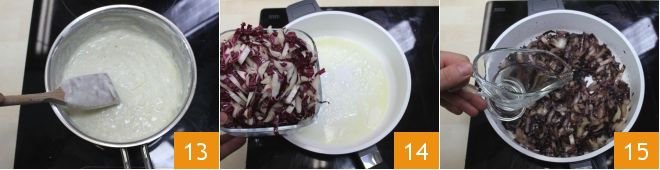 bis die Creme gut eingedickt ist und der Käse vollständig geschmolzen ist, dabei gelegentlich umrühren 13, dann nehmen Sie den Topf vom Herd und stellen die Gruyère-Creme beiseite. In einer Antihaftpfanne schmelzen Sie die restliche Butter, fügen den in Julienne geschnittenen Radicchio hinzu, würzen mit Salz und Pfeffer 14 und löschen mit Weißwein ab 15.