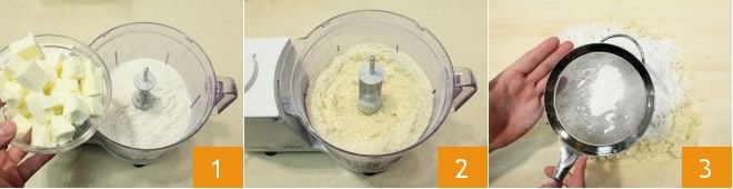 Um die Törtchen mit Frangipane-Creme und Kirschkonfitüre zuzubereiten, beginnen Sie mit der Zubereitung des Mürbeteigs: Geben Sie in einen Mixer das gesiebte Mehl, eine Prise Salz und die kalte Butter aus dem Kühlschrank in Würfeln 1. Mixen Sie alles, bis Sie eine sandige, mehlige Mischung erhalten 2; geben Sie die gewonnene Mischung auf eine Arbeitsfläche (oder in eine Schüssel), formen Sie eine Mulde und fügen Sie in die Mitte den gesiebten Puderzucker hinzu 3.