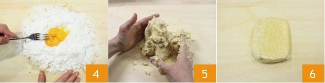 Geben Sie die Eigelbe hinzu und beginnen Sie, alles mit einer Gabel zu vermischen 4. Wenn die Eier das Mehl aufgenommen haben, können Sie von Hand weitermachen: Kneten Sie nur kurz, gerade genug, um den Teig zu formen 5, da der Mürbeteig nicht zu warm werden sollte, damit er schön mürbe bleibt. Formen Sie einen Teigball, flachen Sie ihn ab, damit er schneller auskühlt, und wickeln Sie ihn in Frischhaltefolie 6, bevor Sie ihn mindestens 30 Minuten in den Kühlschrank legen.