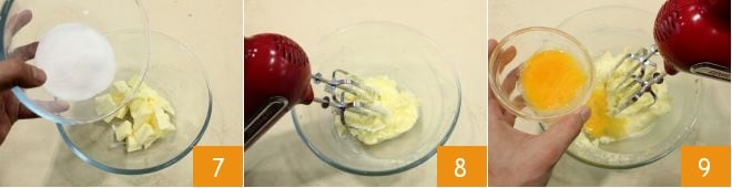 In der Zwischenzeit können Sie die Frangipane-Creme vorbereiten: Geben Sie in eine Schüssel die Butter bei Raumtemperatur in Stückchen und den Zucker 7. Verarbeiten Sie dies mit einem elektrischen Handmixer 8 und wenn die Mischung gut aufgeschlagen ist, fügen Sie ein Ei nach dem anderen hinzu 9, wobei Sie warten, bis sich das vorherige integriert hat, bevor Sie weitermachen.