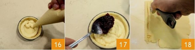 Gehen Sie dann zur Füllung über: Mit Hilfe des Spritzbeutels füllen Sie etwa 1 cm des Bodens der Törtchen mit der Frangipane-Creme 16 und fügen dann die Kirschkonfitüre hinzu, bis die Förmchen bis zum Rand gefüllt sind 17. Gehen Sie dann zur Dekoration über: Rollen Sie den beiseitegelegten Mürbeteig auf eine Dicke von 4 mm aus und schneiden Sie mit einem gezackten Teigrad Streifen von 1 cm Breite 18.