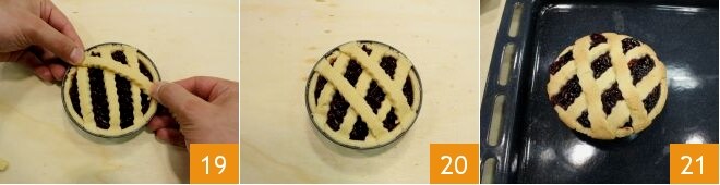 Tragen Sie die Mürbeteigstreifen auf die Törtchen auf, um ein dekoratives Rautenmuster zu erstellen 19. Wenn Sie fertig sind 20, backen Sie sie im vorgeheizten statischen Ofen bei 170° für 40 Minuten (im Umluftofen bei 150° für 30 Minuten). Wenn sie fertig sind, nehmen Sie sie aus dem Ofen 21, lassen Sie sie auf einem Gitter vollständig abkühlen und lösen Sie sie dann aus der Form. Servieren und genießen Sie schließlich Ihre Törtchen mit Frangipane-Creme und Kirschkonfitüre.