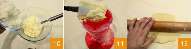 Schaben Sie die Mischung mit einem Spatel von den Seiten und fügen Sie zuletzt das Mandelmehl hinzu 10, dann geben Sie die Creme in einen Spritzbeutel ohne Tülle und stellen Sie sie in den Kühlschrank 11. Nach der nötigen Zeit rollen Sie den Mürbeteig mit einem Nudelholz auf eine Dicke von etwa 1 cm aus 12.