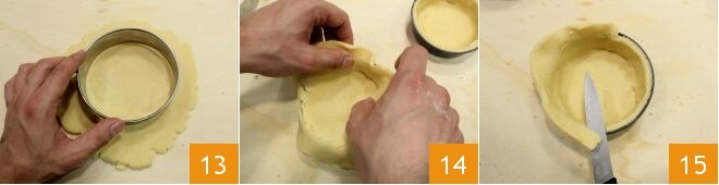 Mit einem Ausstecher mit einem Durchmesser von 14 cm schneiden Sie 4 Scheiben 12 aus und legen Sie damit 4 runde, antihaftbeschichtete Förmchen mit einem Durchmesser von 10 cm und einer Höhe von 3 cm aus, die vorher gebuttert und bemehlt wurden 14; drücken Sie leicht mit den Fingern den Boden und die Ränder, damit der Teig gut haftet, und entfernen Sie dann mit einem kleinen Messer den überschüssigen Teig, wobei Sie den restlichen Teig aufbewahren 15. Wenn Sie einen einzelnen Kuchen machen möchten, können Sie eine Form mit einem Durchmesser von 28 cm und einer Höhe von 4 cm verwenden.