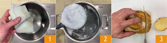 Um die Crostini mit cremigem Stockfisch zuzubereiten, geben Sie als erstes den Stockfisch in einen Topf mit kaltem Wasser 1 und bringen Sie es zum Kochen. Kochen Sie ihn 15-20 Minuten oder bis der Stockfisch zart ist, und entfernen Sie den Schaum, der sich auf der Oberfläche bildet 2. In der Zwischenzeit schneiden Sie das Brot in Scheiben 3.