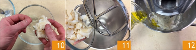 Auch die Gräten entfernen 10 und den Stockfisch mit den Händen zerkleinern. Den Stockfisch in eine Küchenmaschine mit Rühraufsatz umfüllen 11, einschalten und das Olivenöl langsam hinzugeben 12; Sie sollten eine cremige Konsistenz erhalten. Wenn er zu trocken sein sollte, können Sie nach und nach etwas vom Kochwasser des Stockfisches hinzufügen, bis die gewünschte Konsistenz erreicht ist.