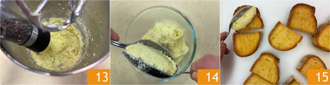 Mit Salz und Pfeffer abschmecken 13. Mit Hilfe von 2 Löffeln Nocken formen 14 und auf die Crostini legen 15.