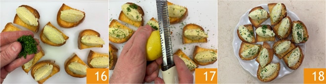 Mit gehackter Petersilie 16 und geriebener Zitronenschale garnieren 17. Ihre Crostini mit cremigem Stockfisch sind bereit, verzehrt zu werden 18!