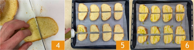 Teilen Sie die Scheiben in Hälften 4, legen Sie sie auf ein mit Backpapier ausgelegtes Blech und beträufeln Sie sie mit Öl 5. Backen Sie sie im Umluftofen bei 200° für 5-7 Minuten 6.