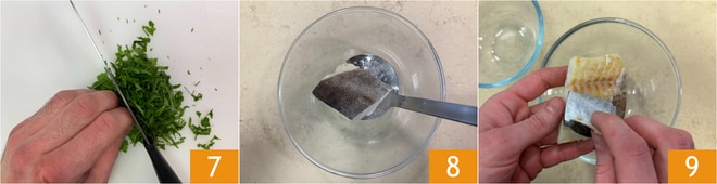 Hacke die Petersilie mit dem Messer 7. Den Stockfisch abgießen 8 und abkühlen lassen, dann die Haut entfernen 9.