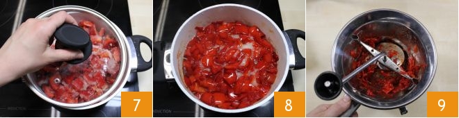 Decken Sie den Topf mit einem Deckel ab 7, lassen Sie jedoch eine Öffnung für den Dampf und lassen Sie alles etwa eine Stunde kochen. Nach der erforderlichen Zeit 8, schalten Sie das Feuer aus und passieren alles durch eine Passiermühle 9, indem Sie sich besonders auf die Schalen konzentrieren, um so viel Fruchtfleisch wie möglich herauszuholen.
