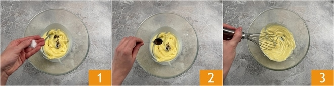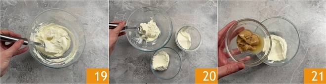 Gut mit einem Spatel umrühren 19, dann die erhaltene Creme in 3 gleiche Teile teilen 20. In einer Schüssel die natürliche Erdnussbutter hinzugeben 21 und gut umrühren.
