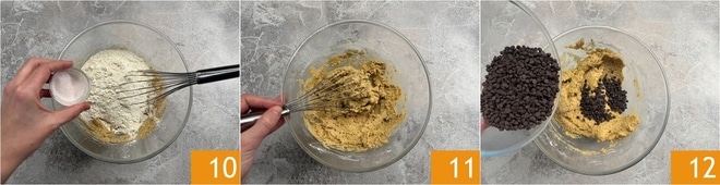 Geben Sie auch das gesiebte Backpulver hinzu 10 und arbeiten Sie kräftig, um eine homogene Mischung zu erhalten 11. Schließlich die Schokotropfen hinzufügen 12.