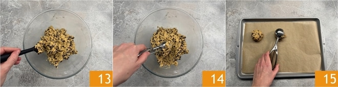 Integrieren Sie diese mit einem Spatel in den Teig 13. Mit einem Eiskugelformer eine Portion Teig entnehmen 14 und direkt auf ein mit Backpapier ausgelegtes Backblech setzen 15.