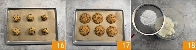 Die Kugeln mit ausreichend Abstand voneinander setzen 16 und bei 165°C für 20-25 Minuten backen. Nach dieser Zeit die Cookies aus dem Ofen nehmen und vollständig abkühlen lassen 17. In der Zwischenzeit das Frosting zubereiten: Den Frischkäse in eine Schüssel geben und den Puderzucker darübersieben 18. Währenddessen die Zartbitterschokolade schmelzen und abkühlen lassen.