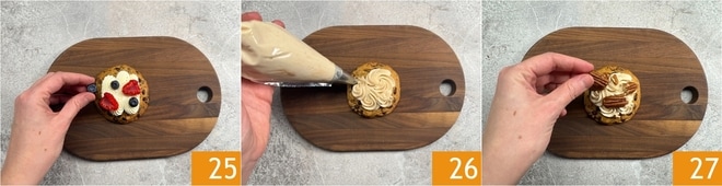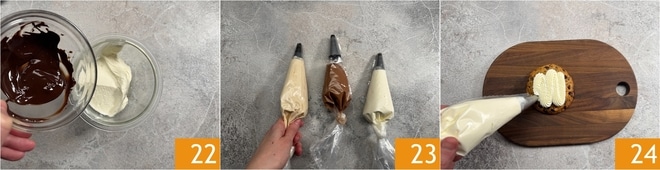 In einer anderen Schüssel die geschmolzene Schokolade hinzufügen 22 und mischen. Die drei erhaltenen Cremes in jeweils einen Spritzbeutel mit einer Tülle Ihrer Wahl füllen 23. Nun zur Dekoration Ihrer Cookies, die inzwischen abgekühlt sind: Für die Cheesecake-Geschmack verwenden Sie das Basis-Frosting und formen ein beliebiges Muster 24.
